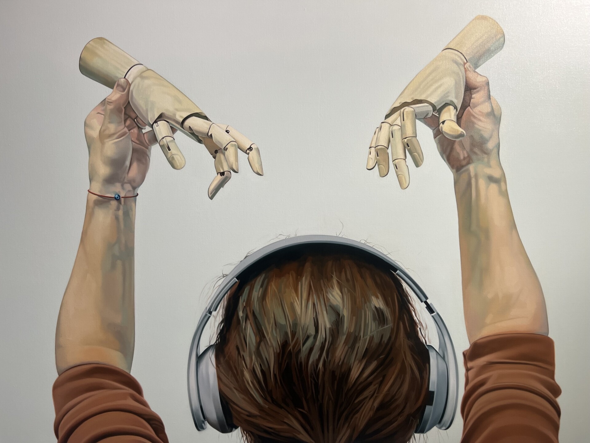 Murka on teost kirjeldanud nii: “Maal “Käsi käes II” sündis ideest kasutada ja mõtiskleda teemal puit. Kuna minu läbivaks karakteriks loomingus on asetunud käed, siis kandus ka puidu teema edasi kätesse. Puidust käed on loodud abimaterjaliks kunstnikele, käte positsioonide visandamisel. Käsi käes on, kui elus ja eluta looduse piiride kompamine. Elus looduse asemele trügib järjest pinevamalt tehislik, mis oma näilise loomulikkusega on justkui ideaalsem ja täiuslikum. Algne koostöö ja omavaheline suhe on õhkõrn ja võib sekundiga muutuda.”